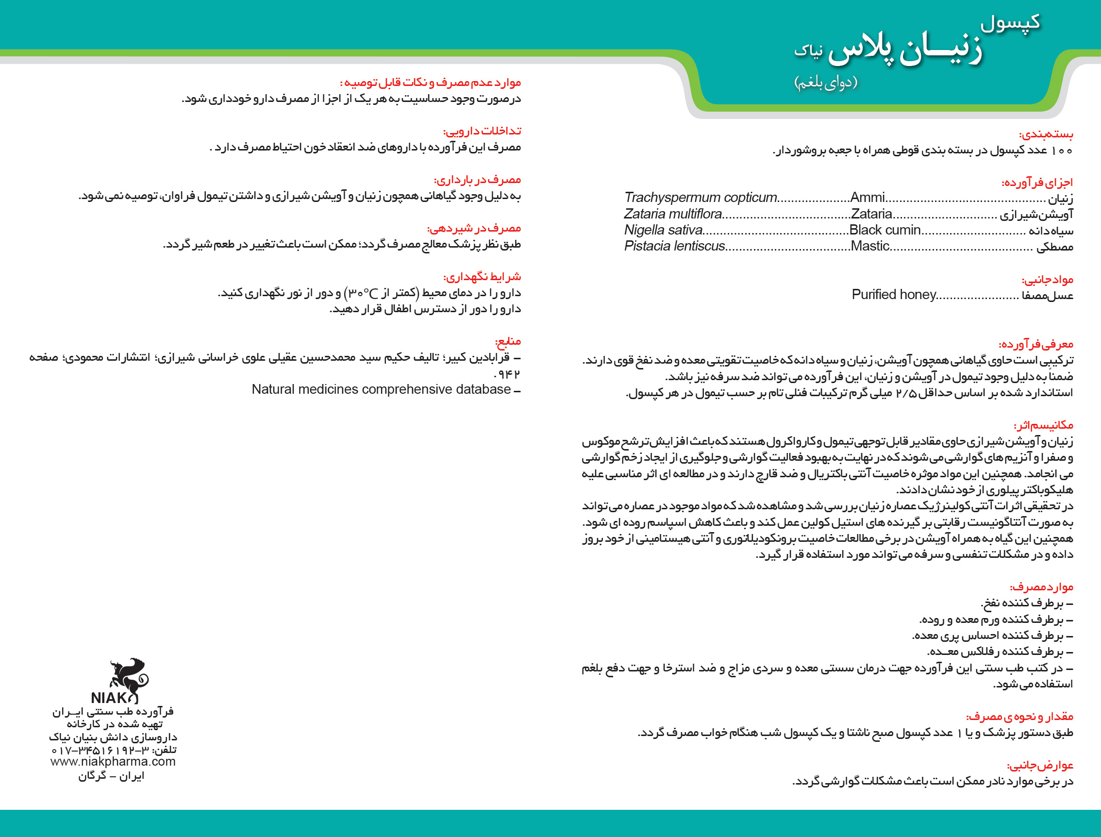 - نام فرآورده: زنیان پلاس نیاک (Zenian Plus )