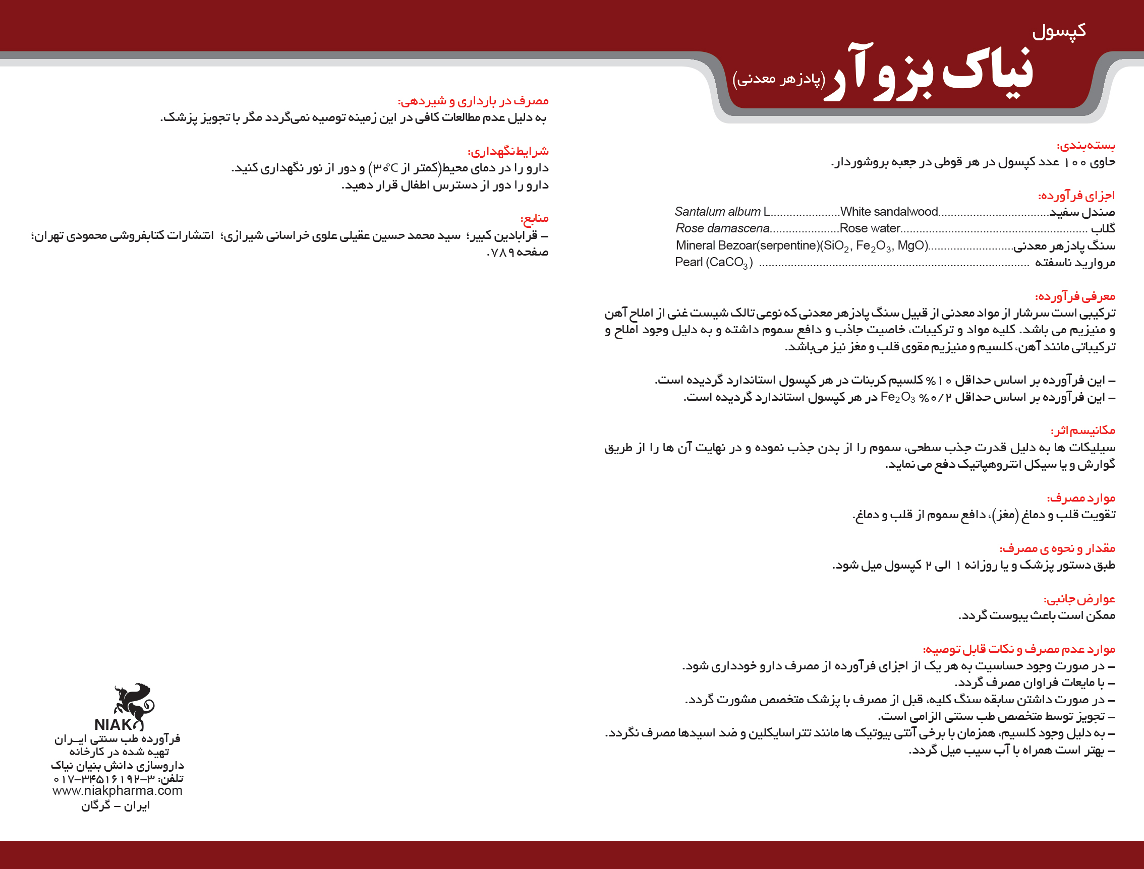 از دیرباز در طب سنتی ایران و هند، ترکیبات معدنی و طبیعی موسوم به بزوآر یا پادزهر معدنی، جایگاه ویژهای در درمان مسمومیتها، اختلالات گوارشی و تقویت قوای حیاتی بدن داشتهاند. این مواد با ساختار معدنی و جذب تدریجی، توان خنثیسازی اسیدها، سموم و فلزات سنگین را دارند و در عین حال موجب تقویت معده، قلب و سیستم عصبی میشوند.کپسول بزوآر (Niak Bezoar) فرآوردهای سنتی-علمی با ترکیب پودر بزوآر معدنی، صدف، گلاب و چوب صندل سفید است که با خنثیسازی سموم و حرارت داخلی، باعث تسکین معده، رفع التهاب و آرامش عمومی بدن میگردد.