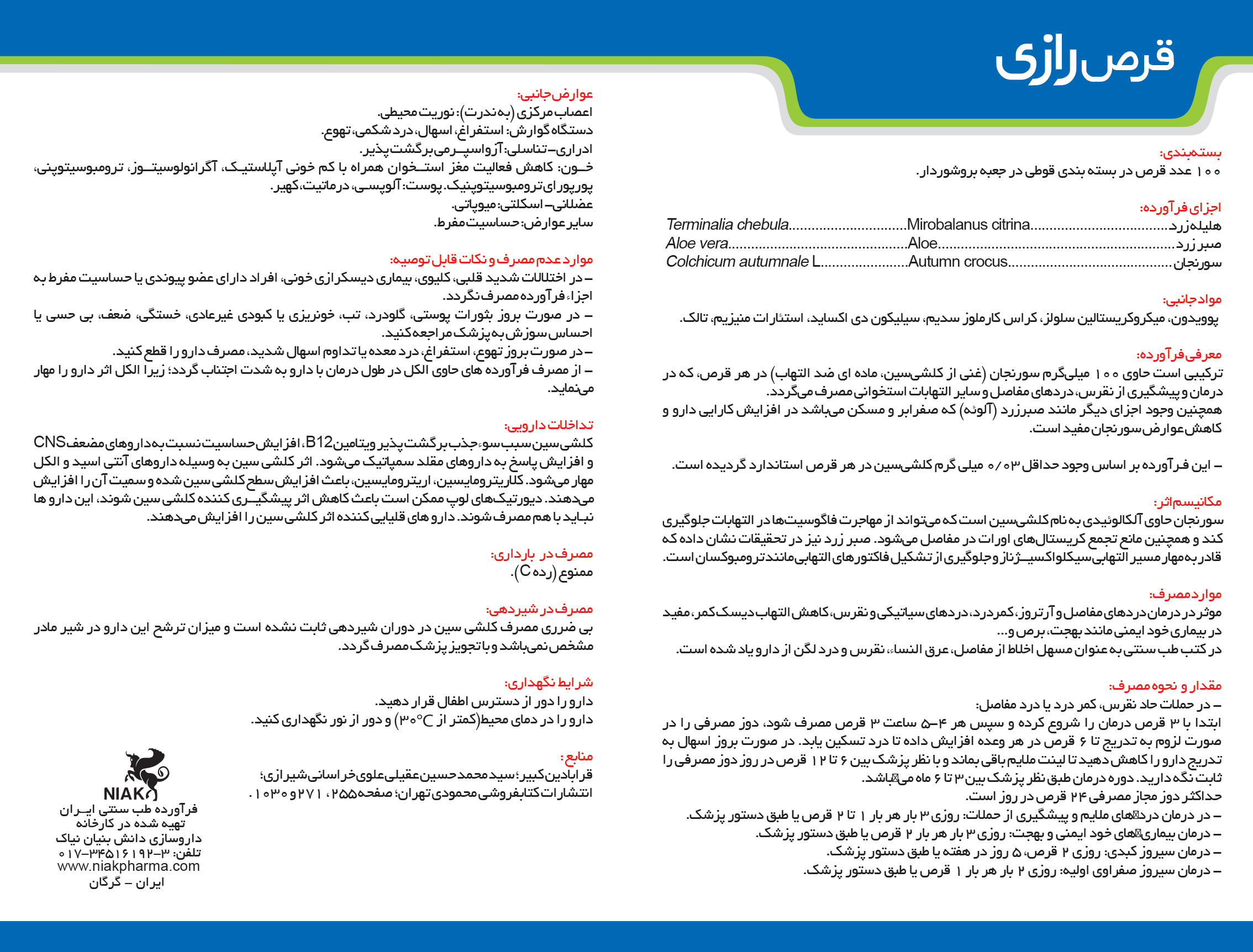 قرص رازی نیاک فرآوردهای علمی و طبیعی است که با ترکیب سورنجان (منبع کولشیسین)، هلیله زرد و صبر زرد (لاتکس آلوئهورا)، اثرات ضدالتهاب، ضداسپاسم و ضد درد مفصلی را بهصورت همافزا اعمال میکند. این دارو بهعنوان درمان کمکی یا جایگزین طبیعی برای بیماران مبتلا به حملات نقرس و دردهای مفصلی التهابی قابل استفاده است و با کاهش التهاب و تسکین سریع درد، کیفیت زندگی بیماران را بهبود میبخشد.