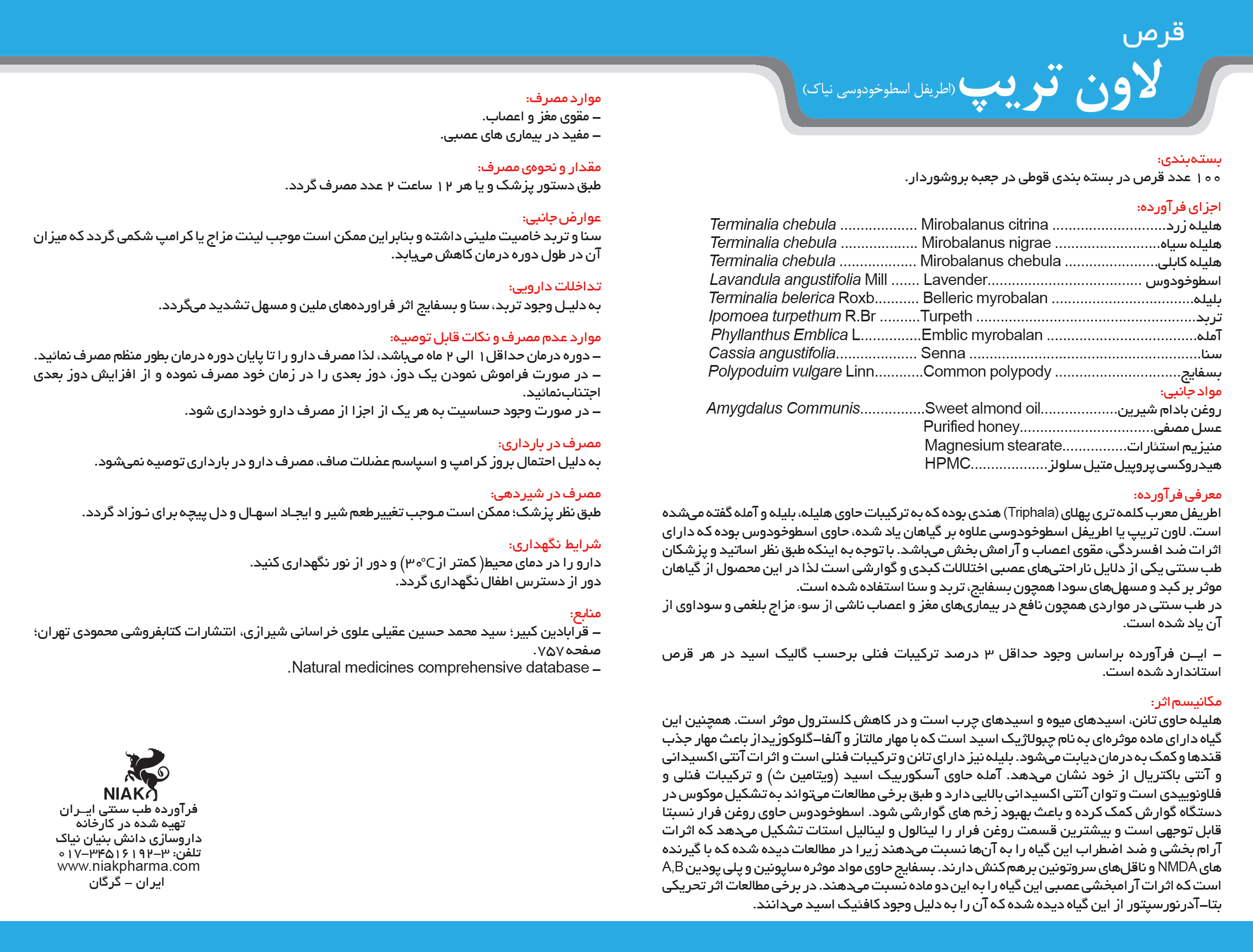 - شکل دارویی: قرص گیاهی روکشدار در بستههای ۱۰۰ عددی